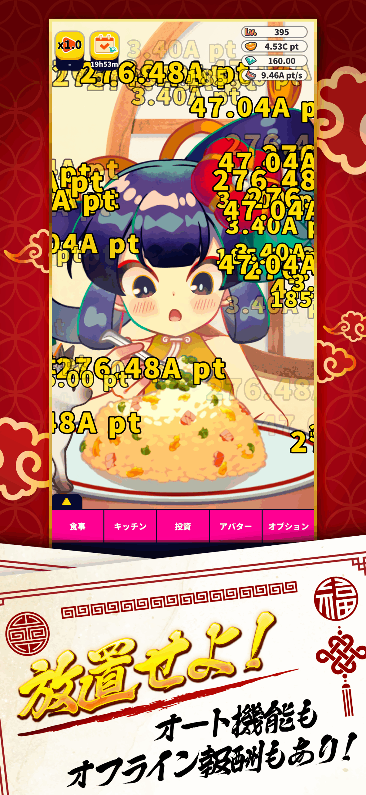 画面をタップ(連打)してコインを貯め、コインを使って料理を豪華にしたり、